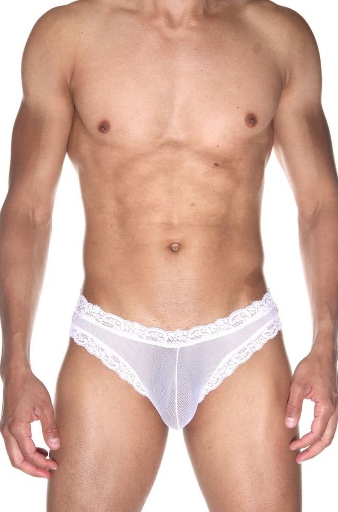 Белые мужские бразилиана из полупрозрачного легкого тянущегося материала. Кант из кружевной белой ленты.