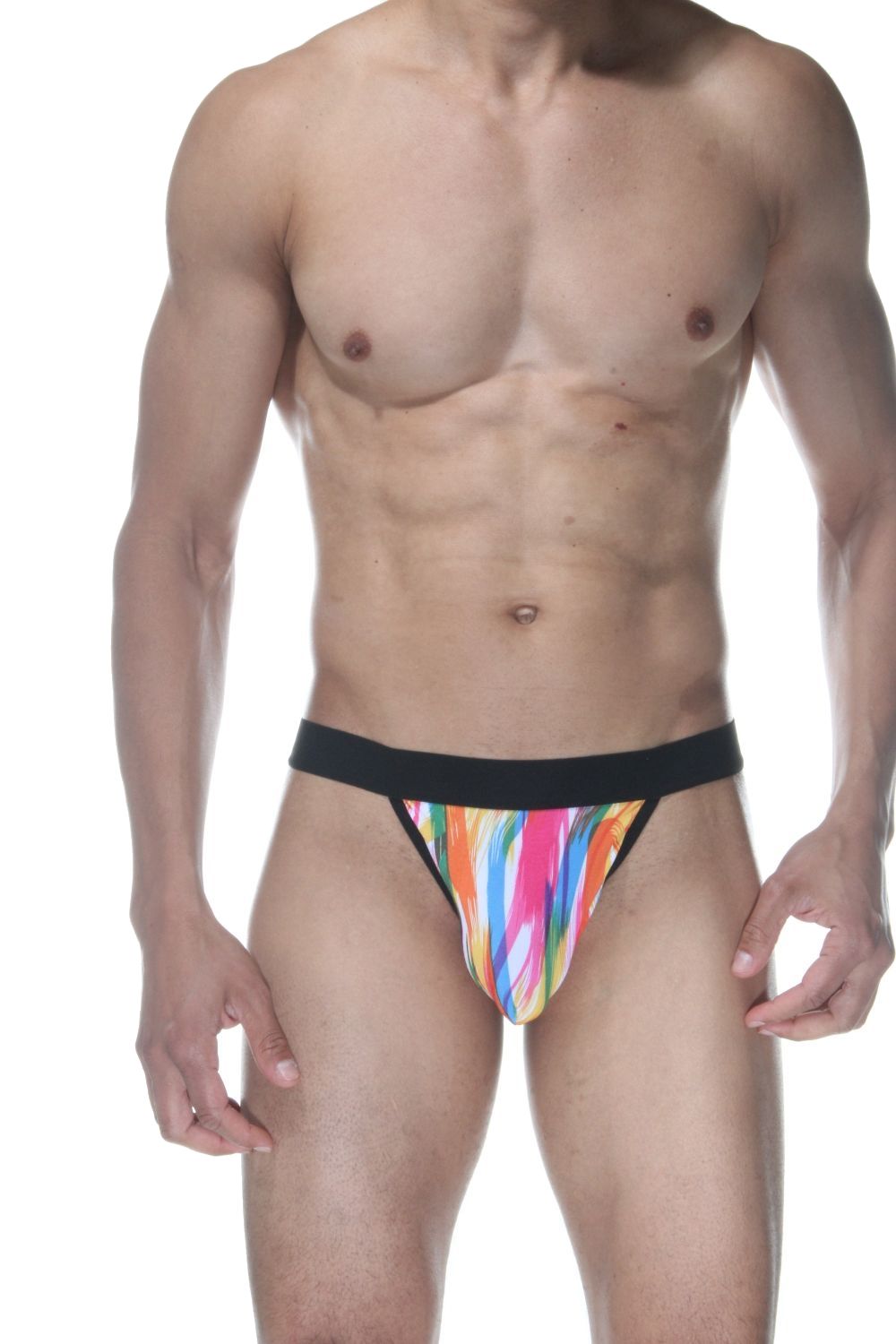 Мужские трусы-стринги с принтом в виде разноцветных мазков кисти.
