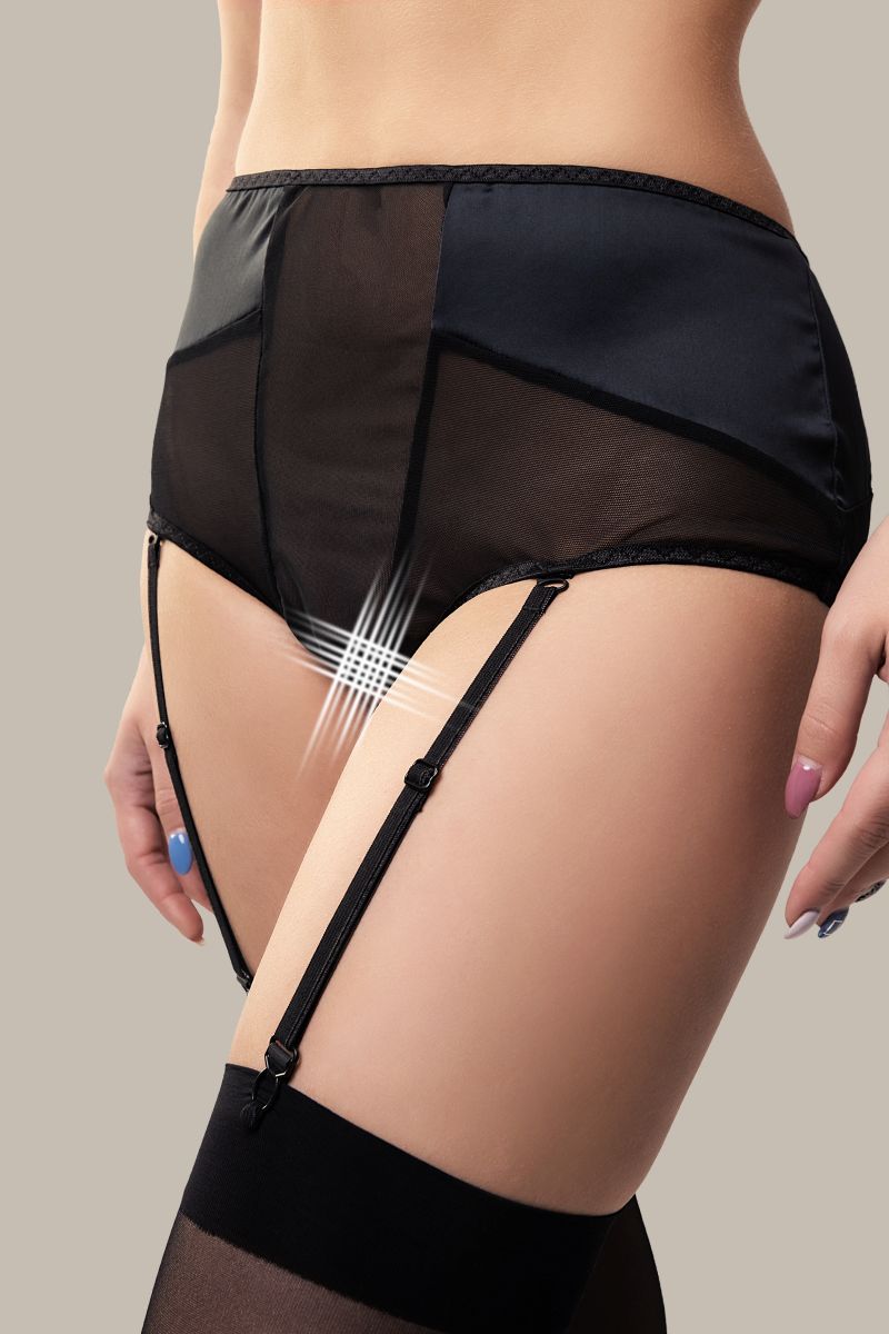 Эротические трусики-пояс для чулок «Э́лэгэнс» (англ. Elegance – «Элегантность») из тонкой прозрачной эластичной сетки и стрейч-сатина облегают бедра, ощущаются невесомыми, не сковывают движений, но визуально меняют силуэт. Шелковистая поверхность материала дарит приятные ощущения при прикосновении. Современные элементы дизайна тешат женское самолюбие. Трусики с высокой талией зрительно удлиняют ноги, подчеркивают сексуальный переход от талии к бедрам. Непрозрачные вставки скрадывают объем в области бедер. Швы, вытачки и регулировка по талии создают силуэтную посадку. Съемные регулируемые пажи, открытая зона копчика и эротический доступ подчеркивают чувственный образ. Чулки не входят в комплект!