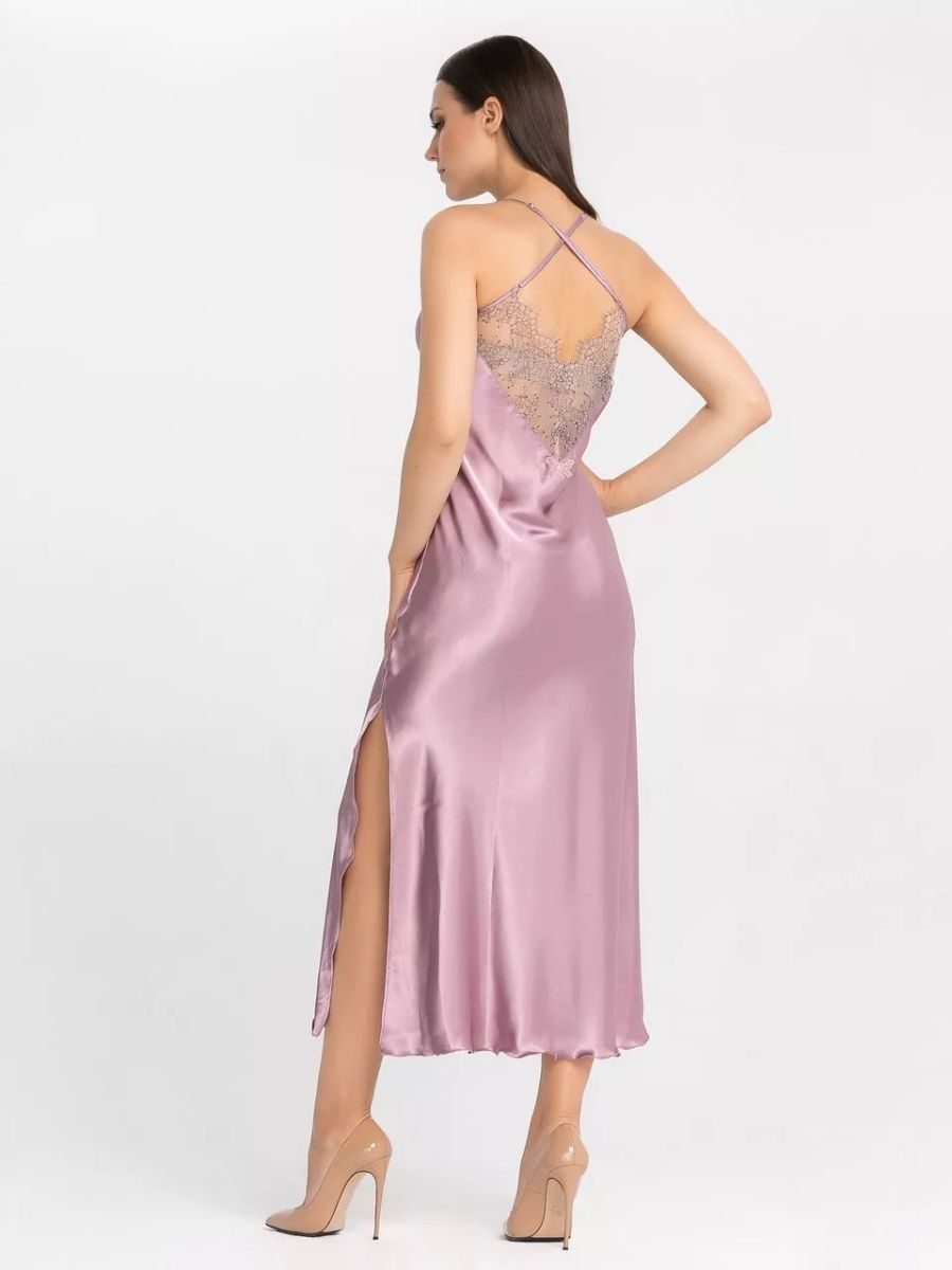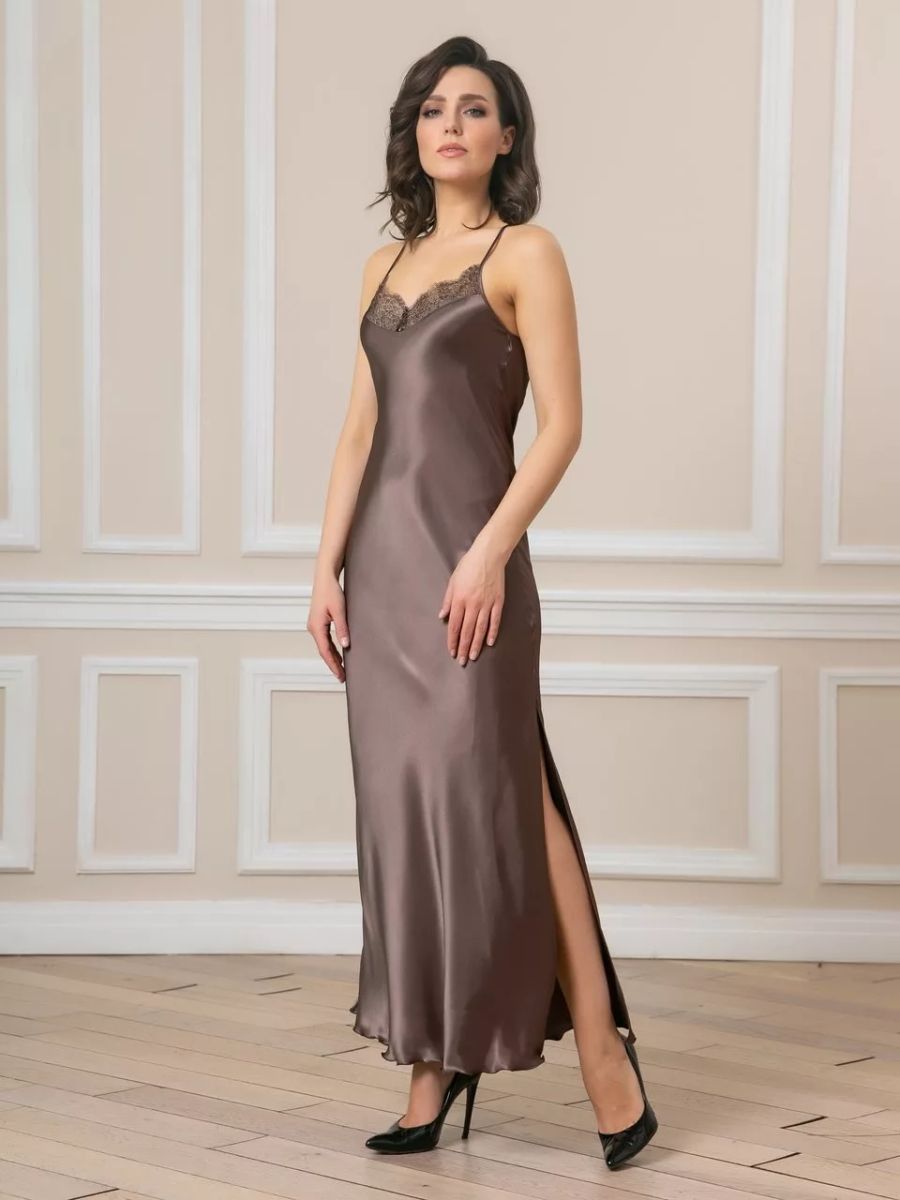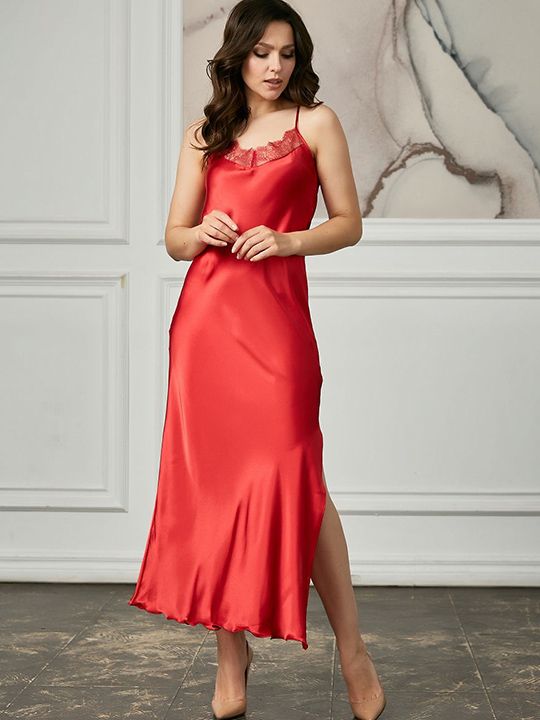 Длинная сорочка на узких бретелях из искусственного шелка, декорирована кружевом по линии декольте и разрезом до колена.