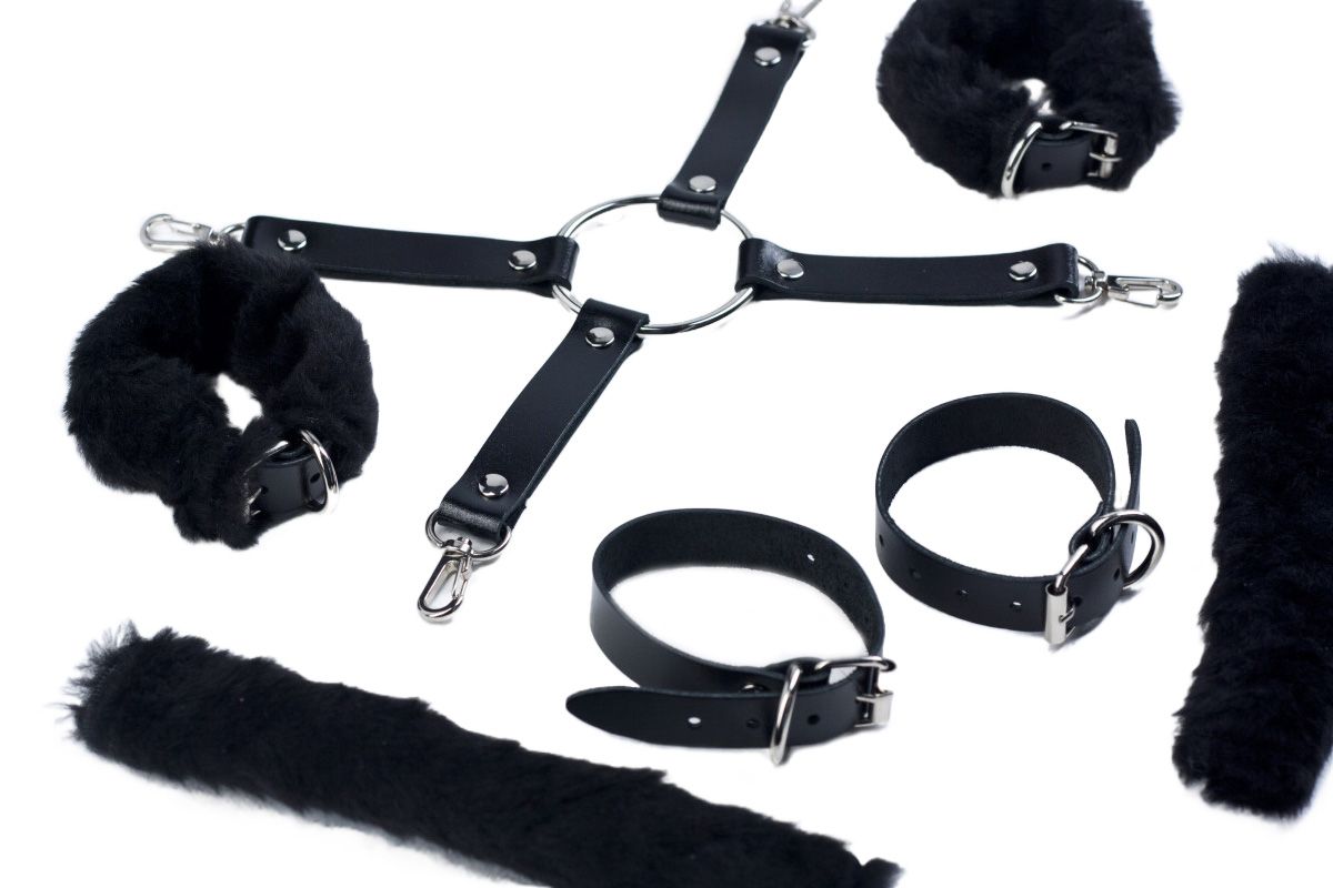 Набор для фиксации с четверным креплением, кольцом в центре и карабинами на концах. Особенности: - черная натуральная кожа (1.8-2 мм), 1 слой - черный съемный искусственный мех - набор 2 в 1: можно использовать с мехом для нежной фиксации, или снять мех и получить более жесткую версию - удлиненные размеры ремней для ног и для рук - соединение - металлическое кольцо к которому на кожаных ремешках прикреплены карабины - никелированная металлическая фурнитура - размеры регулируются пряжкой.