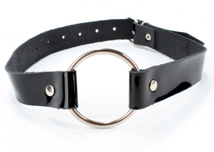 Кляп-кольцо на чёрных лаковых ремешках.