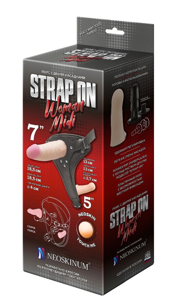 Изделие рассчитано не только на отношения между женщинами, но также женщиной и мужчиной. Многолетний опыт производства и изучение отзывов покупателей позволили усовершенствовать конструкцию для создания дополнительных возможностей. В частности, предусмотрен бандажный пояс, многослойное покрытие, бархатная, влагопоглощающая внутренняя сторона. Дополнительно акцент сделан на максимальном комфорте, атравматичности, точной регулировке фастексами. Для регулировки предназначены и 2 отверстия под соединительные ёлочки-коннекторы, если потребуется изменить расстояние между насадками. Пояс WOMAN MIDI снабжен 2 насадками. Одна из насадок крупнее и исполнена из полумягкого материала. Маленькая, полумягкая насадка – внутренняя и предназначена для автостимуляции при сексуальном контакте. 2 коннектора и универсальность стыковочного узла позволяют использовать абсолютное большинство насадок, продающихся отдельно. HARNESS выполнен в классическом стиле БДСМ и легко входит в сочетания подобных аксессуаров. Материалы и сырье прошли добровольную сертификацию и имеют соответствие токсикологическим нормам. Размер пояса - 44-60. Рабочая длина - 18,5 см. Длина вагинального отростка - 13 см., диаметр - 3,7 см.